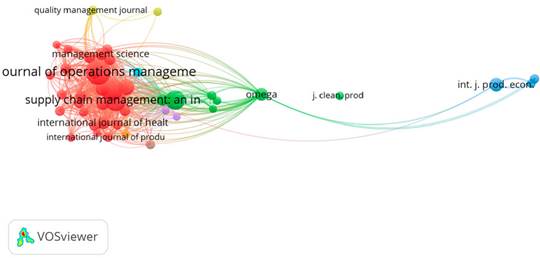 Clúster 2. Cadena de suministro: conformado por un total de 30 revistas, las cuales abarcan diferentes áreas de conocimiento, entre las que se destacan la logística, la gestión estratégica y la gestión de la calidad aplicadas en disciplinas como ingeniería, sistemas, salud y negocios.