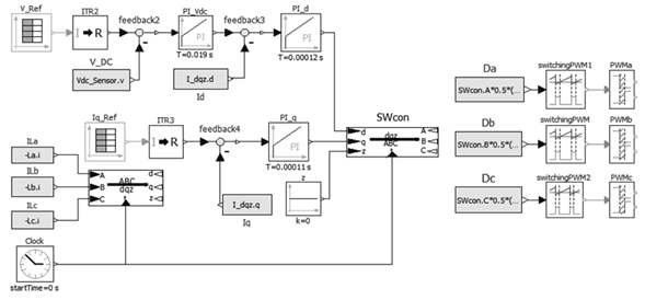 The DC bus voltage control consists initially in obtaining the difference between the reference voltage V Re f and the DC bus voltage V DC measured by the Vdc Sensor sensor in Figure 11. Then, this difference is taken to the PI Vdc controller which has an integral time Ts = 0,019s and a gain K = 0,335. The resulting control signal is compared to the current I d and the difference is taken to the PI d controller which has a time integral Ts = 0,00012 and a gain K = −1,8054. The result is the control signal for the capacitor voltage C at dqz. The reference voltage value at t = 0s is V Re f = 610V and at t = 1,3s V Re f = 615V.