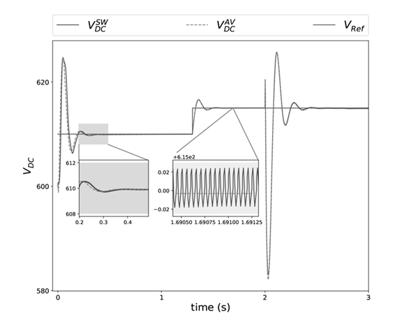 By comparing the switch-based model with the proposed average switch model, it is observed that voltage and current for both models match quite well, the signals of the average model correspond to the signals of switch-based model conserving the transient behavior but eliminating the ripple. It is very important to point out that the simulated system is composed of AC and DC power interfaces such as inverters and converters but also batteries that introduce other types of non-linearities in the system. In other words, a wide range of PE devices was included in the simulation.