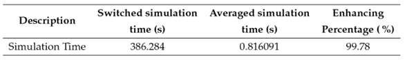 Simulation times were substantially reduced. The simulation using the switch-based model took 386.284 seconds, while the simulation using the proposed average model took 0.816 seconds. This represents a reduction time of 99.788 %. It can be concluded that applying the average model to the switch in PE devices is an alternative that allows to simulate while preserving the low dynamics of the system, with an important reduction of the simulation time, which opens the possibility to simulate more complex systems such as microgrids or other complex PE systems using home or office computers