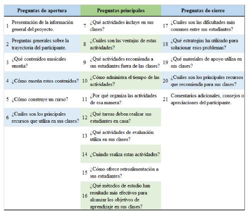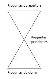 Si bien esta flexibilidad es deseada, es necesario un guion inicial a partir del que se puedan hacer ajustes. Carlos Muñoz (2011) propone un modelo de "reloj de arena" que consiste en organizar las preguntas en tres fases: 1) preguntas de apertura: que sirven para establecer un ambiente cómodo para el participante e introducirlo al tema principal de la entrevista; 2) preguntas principales: que tratan temas específicos; y 3) preguntas de cierre: que permiten al participante hablar de manera libre y así brindar información relevante que no había tenido en cuenta el investigador en el diseño original de la entrevista (figura 1).