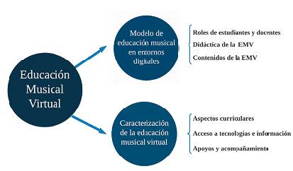 Con base en lo anterior, esta aproximación toma como uno de sus ejes la caracterización de la educación musical virtual como resultado de la reflexión en torno a la realidad de los docentes y de los estudiantes, tomando en cuenta sus roles y relaciones como se explicará más adelante. Del mismo modo, este ejercicio permitió la reflexión a partir de la pregunta fundamental: ¿cómo enseñar música en entornos digitales?, como respuesta a la cual se proponen ideas iniciales sobre una didáctica de la educación musical virtual que incluyen principios para tener en cuenta en los procesos de evaluación y en la estructuración y el ajuste de contenidos en función de las necesidades de aprendizaje específicas del contexto de la educación musical superior.