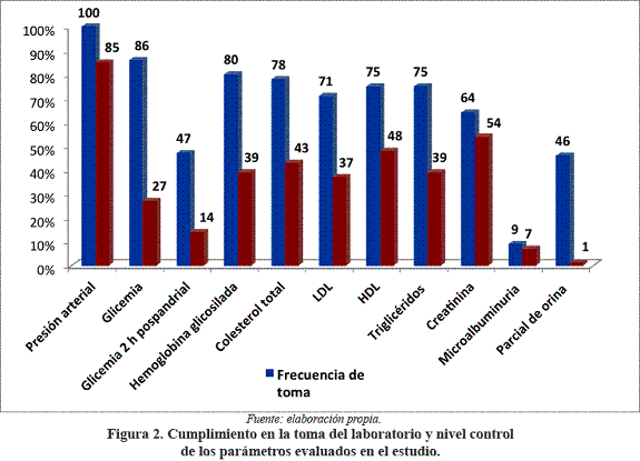 En el control de los laboratorios de seguimiento en los pacientes del programa, se observó que los marcadores de control (hemoglobina glicosilada, colesterol HDL, triglicéridos) o de progresión de la enfermedad (como creatinina, parcial de orina o la microalbuminuria) tienen un bajo porcentaje de control. En lo referente a las cifras tensionales de esta población se aprecia un adecuado nivel de control (ver Figura 2).