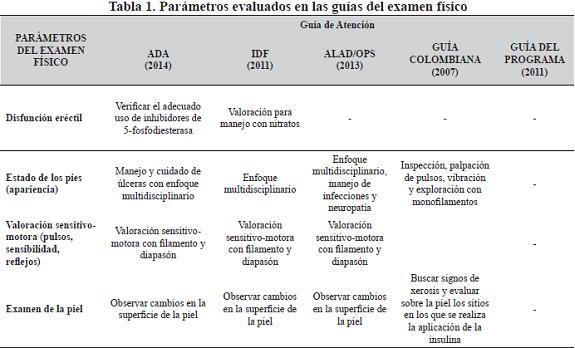 Todas las guías usan parámetros similares para la evaluación de los pacientes diabéticos, enfocándose principalmente en factores de riesgo, examen físico, signos vitales, control paraclínico y valoración de estilos de vida; aspectos indispensables para el adecuado control de la enfermedad, que además tienen alto impacto sobre su progresión, desarrollo de complicaciones y calidad de vida. Se hace indispensable que estos parámetros sean tenidos en cuenta para prevenir o mitigar el desarrollo de la enfermedad con sus consecuencias asociadas.