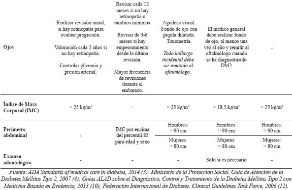 De estas guías se encontraron múltiples parámetros para ser evaluados en este tipo de pacientes dentro del seguimiento de su patología y las metas de control, como se muestra comparativamente en Tabla 1 (examen físico), Tabla 2 (datos de laboratorios) y Tabla 3 (de otras valoraciones relevantes para el seguimiento de la DM2.