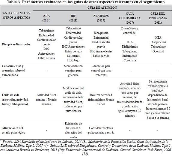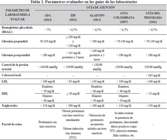 Objective: To perform a comparative analysis of the management and control of a group of patients with diabetes mellitus type 2, belonging to a promotion and prevention program in Bogotá, regarding the program management guide and recommendations documented by other societies at the national and international level. Materials and Methods: A descriptive cross-sectional study was conducted from the medical history of patients. It was determined whether the evaluated parameters to control their disease were the necessary ones and were being applied correctly. Results: The 412 resolution documents, the ALAD guide (2013), the PAHO guide (2013), the ADA (2014) Guide and the IDF (2006) guide were analyzed. Then, 274 histories were reviewed, analyzing the hysical examination parameters, paraclinicals and other variables (cardiovascular risk, self-care, knowledge of the disease, psychological state). It was evidenced that the control of the physical exam aspects that mark the progression of the illness and the microvasculature damage are overlooked as well as the behavioral, cultural and informative character interventions (promotion of healthy lifestyles, learning of self-care measures, phychological stability). Differences in control values of praclinicals in the revised guides have been also observed. Conclusion: Variation in evaluation parameters, follow up and disease control in each guide have been observed, taking into account the different populations and being necessary that the guides are adapted considering the characteristics of Colombian people as far as their epidemiological profiles and health determinants.