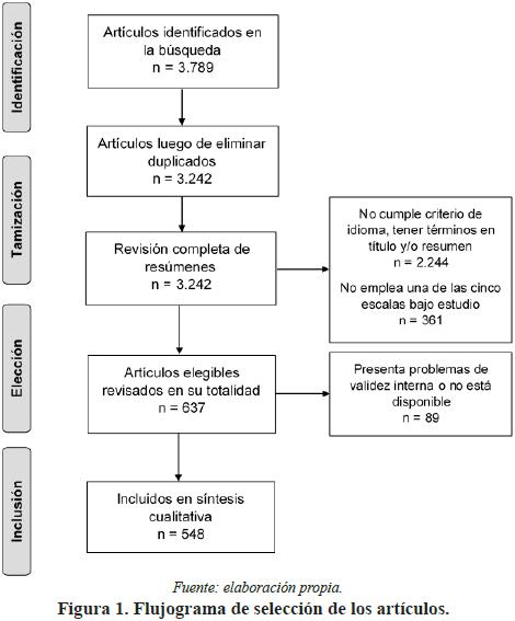En la búsqueda se identificaron 3.789 estudios sobre CVRS en adolescentes, de los cuales 547 eran duplicados; a partir de los filtros propios de las bases de datos consultadas se eliminaron 2.244 estudios aplicando dos criterios de inclusión y otros 450 con base en la constatación de baja validez interna y el no utilizar una de las cinco escalas de CVRS investigadas; de esta forma, se incluyeron en la síntesis de resultados un total de 548 estudios (Figura 1).