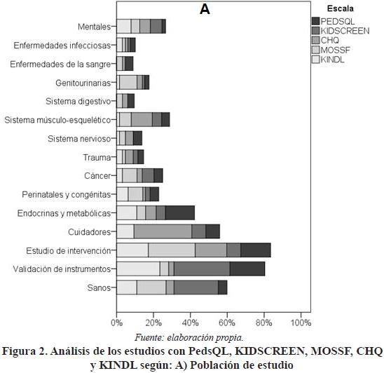 En los estudios que usaron el PedsQL la mayor proporción correspondió a enfermedades endocrinas y metabólicas (15%), estudios de intervención (16%) y de validación (18%), los demás grupos presentaron un uso menor del 5%; en KIDSCREEN fueron validación (30%) y estudios en sanos (24%), CHQ en cuidadores (30%) y de intervención (16%), MOSSF en intervención (23%) y sanos (15%), y KINDL en validación (22%) e intervención (16%) (Figura 2A).