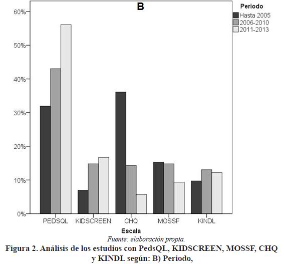 Los análisis según periodo de estudio demostraron que hasta 2005 la escala más empleada era el CHQ (36%, seguida del PedsQL con el 32%), en el quinquenio 2006-2010 presentó mayor frecuencia de uso el PedsQL (43%, los demás correspondieron a cerca del 15%) y en el último trienio fueron el PedsQL (56%) seguido de KIDSCREEN (17%) (Figura 2B).