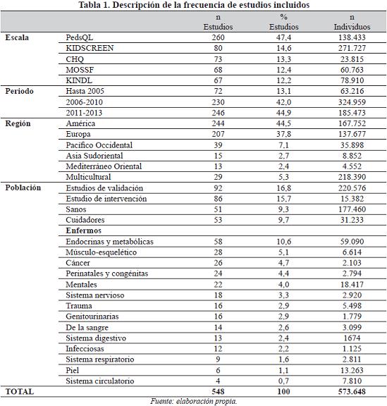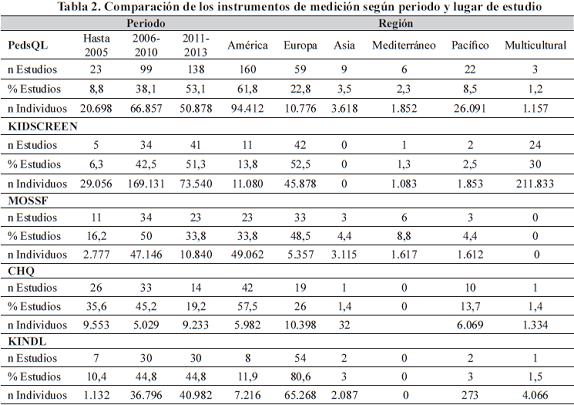 En KIDSCREEN el 51% de los estudios se hizo en el último trienio, siendo mayor su uso en Europa con un 53% y cerca de 46.000 sujetos estudiados. En MOSSF el 48,5% de estudios se hicieron en Europa, pero el número de individuos incluidos en las investigaciones de América es cerca de 9 veces más; contrario a lo registrado en CHQ donde el 57,5% de las investigaciones se hizo en América pero la población incluida en estos es cerca de la mitad de los Europeos (que registraron el 26% de las investigaciones). KINDL predomina en Europa, donde se reportaron el 80,6% de los estudios y el mayor número de adolescentes estudiados (Tabla 2).