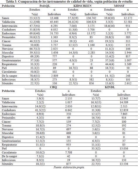 Con respecto a la población de estudio, en los adolescentes sanos la mayor proporción de publicaciones se observaron en el KIDSCREEN (37,3%), seguido del PedsQL (23,5%), además el KIDSCREEN fue el instrumento aplicado en el mayor número de individuos sin enfermedad (136.742). El PedsQL fue la escala proporcionalmente más usada en todas poblaciones (por ejemplo este instrumento se empleó en el 52,2% de los estudios de validación e intervención, en el 69% de las enfermedades endrocrinas-metabólicas, 69,2% de los estudios en enfermedades del sistema digestivo y 78,6 de las investigaciones en enfermedades de la sangre), con excepción del grupo de cuidadores donde fue más utilizado CHQ (41,5%) y en enfermedades del sistema respiratorio el MOSSF (Tabla 3).