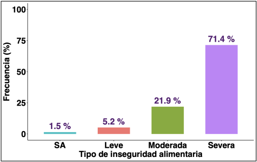 De la totalidad de las familias participantes en el estudio, se pudo establecer que 71,4 % (n=277) sufrían de inseguridad alimentaria severa y solo 1,5 % (n = 6) contaban con seguridad alimentaria. La distribución completa de los niveles de seguridad alimentaria se puede observar en la Figura 1.