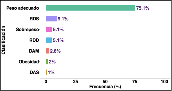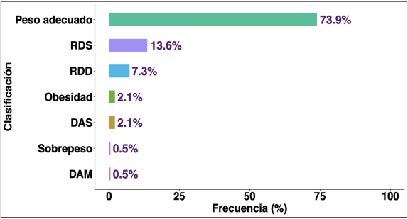 Abreviaturas: RDS = riesgo de sobrepeso, RDD = riesgo de desnutrición, DAS = desnutrición aguda severa, DAM = desnutrición aguda moderada.