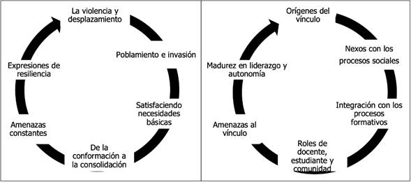 Los entrevistados recordaron el poblamiento marcado por el padecimiento durante años de sucesivos ultrajes y desalojos de sus ranchos en los terrenos recién ocupados, a manos de las fuerzas del orden y agentes del Estado, hasta terminar ocupando el que hoy constituye su albergue. Aun así, los pobladores al hacerse conscientes de sus capacidades y del liderazgo de algunos de ellos, han ganado en autoestima y sentido de pertenencia. Sus aprendizajes colectivos en la conformación del sector y el insistir en mantener la cohesión, son expresiones de la capacidad de resiliencia adquirida en todo este proceso de poblamiento y desalojo, lo que facilita comprender la consolidación de la conciencia colectiva. La construcción de tejido social mediante el diálogo, la lucha pacífica, el compromiso constante, el no dejarse manipular por ninguna de las expresiones del poder fáctico, el mantenerse firmes en el deseo de buscar soluciones sin ambiciones personales y buscar recursos para toda la vereda, son expresiones de la identidad lograda con su liderazgo. “Vivo acá con mi esposo hace cinco años...hemos estado luchando hombro a hombro con la comunidad para así bregar a subsistir, porque esa es la idea acá, subsistir” (E7-Lideresa, 5 años en la vereda).
