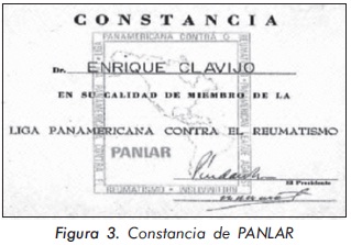 A su vez, el Dr. Píndaro Martínez, Presidente de la Liga Panamericana contra el Reumatismo (PANLAR), hizo entrega a los miembros de la Junta Directiva de la Constancia como miembros de esa organización (Figura 3) y al Dr. Fernando Chalem como representante de la ACR ante PANLAR.