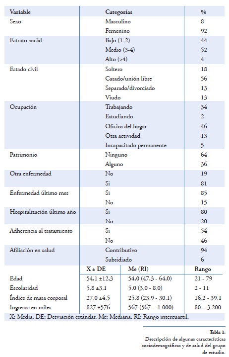 El 92% del grupo de estudio fueron mujeres, aproximadamente la mitad pertenecientes a estrato social medio, casados o en unión libre, el 46% tiene como ocupación los oficios de hogar, el 64% no presenta patrimonio, la prevalencia de comorbilidad fue de 81%, el 85% presentó enfermedad o accidente el mes previo a la realización del estudio, el 80% fue hospitalizado al menos una vez durante el último año y el 94% está afiliado al régimen contributivo en salud (Tabla 1). Entre las principales comorbilidades se registró osteoartrosis (23%), artritis reumatoide (16%), osteoporosis (10%) y lupus eritematoso sistémico (7%).