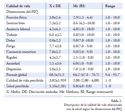 El puntaje promedio de salud percibida fue 5, mientras que el de calidad de vida percibida fue 3. En las 10 dimensiones del FIQ el resultado más favorable fue la función física, mientras que los puntajes más deficientes se registraron en dolor, fatiga y sentirse bien; por su parte, el puntaje global de CVRS presentó una media de 60,5 y el 50% de los valores centrales estuvo entre 48 y 77 puntos (Tabla 2).