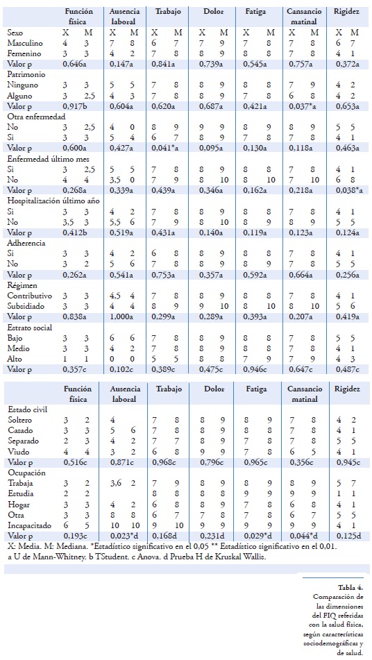 En la comparación de las dimensiones del FIQ, según las características del grupo de estudio, se observó una correlación estadísticamente significativa con la salud y calidad de vida percibidas; la edad presentó correlación con sentirse bien, fatiga, cansancio matutino, rigidez y el puntaje global de CVRS; el ingreso se correlacionó con la función física, mientras que la escolaridad y el IMC no presentaron correlación estadísticamente significativa con ninguna dimensión (Tabla 3).