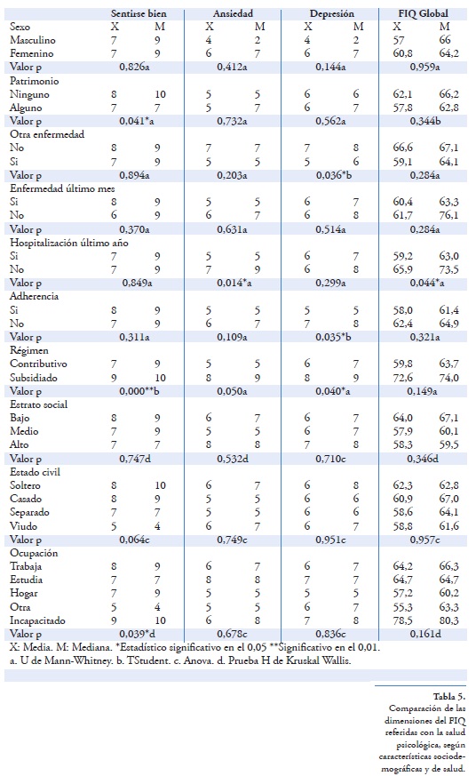 Los puntajes de cada una de las dimensiones del FIQ se compararon según las variables independientes así: i) con la edad, los años de estudio, los ingresos mensuales y el IMC a través de coeficientes de correlación de Spearman, ii) con variables dicotómicas como sexo, patrimonio, comorbilidad, presencia de enfermedad el último mes y hospitalización el último año, adherencia terapéutica y régimen de salud mediante las pruebas t Student y U de Mann Whitney, y iii) con las variables politómicas como estrato social, estado civil y ocupación a través de Anova y H de Kruskal Wallis. La elección de pruebas paramétricas o no paramétricas se realizó según el cumplimiento del supuesto de normalidad bi variada y el de homocedasticidad para el Anova. Se realizaron las pruebas de normalidad de Kolmogorov Smirnov con corrección de la significación de Lilliefors y Shapiro-Wilk, y prueba de homogeneidad de varianzas por el estadístico de Levene.