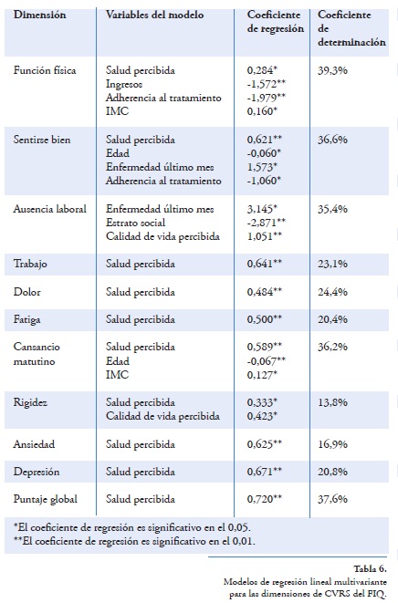 En la tabla 6 se presentan los modelos de regresión para cada una de las dimensiones de CVRS y el puntaje global, en éstos se observó que la salud percibida fue una de las variables más importantes para casi todos los dominios analizados, además, las variables incluidas en cada dimensión del FIQ presentaron un valor explicativo importante al registrar coeficientes de determinación entre 14% y 39% (Tabla 6).