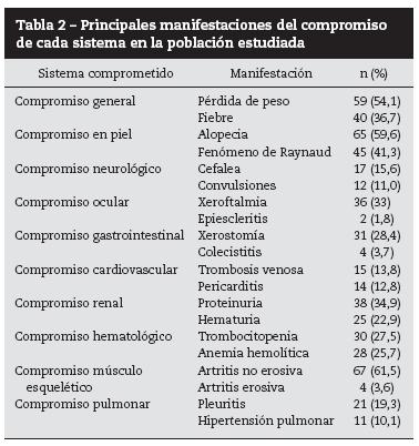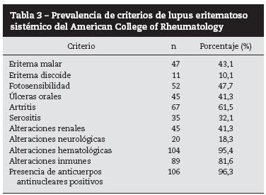 En la tabla 3 se resume la frecuencia de los principales criterios de LES del ACR para la población estudiada.