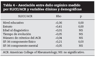 Se encontró correlación moderada e inversa entre el daño orgánico y el estrato socioeconómico (–0,41) y el nivel educativo (–0,36); la correlación entre el puntaje del SF-36 componente físico (–0,21) y daño orgánico fue débil (tabla 4).