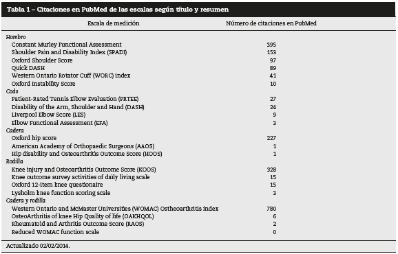 Las escalas de medición más citadas en PubMed fueron la Western Ontario and McMaster Universities (WOMAC) Ostheoarthritis Index para cadera y rodilla con 780 citaciones, seguida por la Constant Murley Functional Assessment para hombro con 395 citaciones, Knee injury and Osteoarthritis Score y Oxford Hip Score con 328 citaciones para rodilla y 227 para cadera, respectivamente (tabla 1).