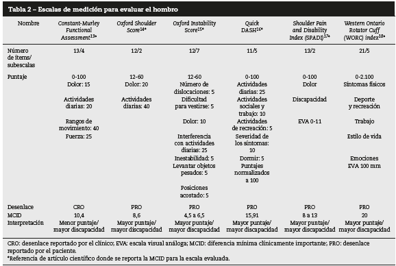 Las escalas que evalúan el hombro como la Constant Murley Functional Assessment, Quick DASH y Shoulder Pain and Disability Index se puntúan de 0 a 100; Oxford Shoulder Score y Oxford Instability Score se puntúan de 12 a 60; la escala Western Ontario Rotator Cuff Index de 0 a 2.100, y todas se interpretan según el desenlace reportado por el paciente, entendiendo a mayor puntaje, mayor discapacidad, excepto la Constant Murley Functional Assessment, que se interpreta según el desenlace reportado por el clínico y a menor puntaje, mayor discapacidad (tabla 2).