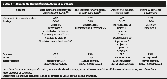 Las escalas que evalúan rodilla como la Knee injury and Osteoarthritis Score y Lysholm Knee Function scoring scale se puntúan de 0 a 100; la Oxford 12-item knee questionare se puntúa de 12 a 60, y la Knee outcome survey activities of daily living scale de 0 a 80; todas se interpretan según el desenlace reportado por el paciente excepto la Knee injury and Osteoarthritis Score, que se interpreta según el desenlace reportado por el clínico; y todas se analizan como a menor puntaje mayor discapacidad, excepto la Oxford 12 ítems knee questionare, que se analiza como a mayor puntaje, mayor discapacidad (tabla 5).