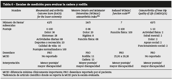 Las escalas que combinan la evaluación de cadera y rodilla como la Rheumatoid and Arthritis Outcome Score for the lower extremity y la Reduced WOMAC function scale se puntúan de 0 a 100; la WOMAC de 0 a 96 y la Osteo Arthritis of Knee Hip Quality of Life de 1 a 10; todas se interpretan según el desenlace reportado por el paciente y se analizan como a menor puntaje, mayor discapacidad, excepto la WOMAC, que se analiza como a mayor puntaje, mayor discapacidad ( tabla 6).