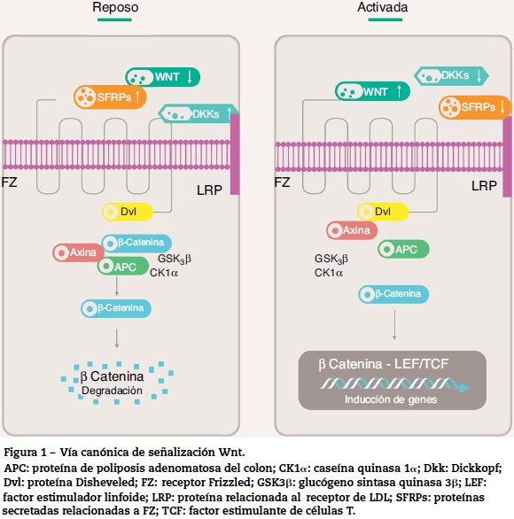 Las moléculas Wnt luego de ser secretadas por células se unen al receptor Fz, el cual forma un complejo con la proteína receptora de LDL (LRP) que actúa como correceptor. Esta unión favorece una cascada de señalización en la cual participan varias proteínas intracelulares: Disheveled (Dvl), glucógeno sintasa quinasa 30 (GSK30), poliposis adenomatosa coli (APC) y caseína quinasa 1 (CK1). En reposo, la p-catenina es fosforilada por la GSK30 mientras esta forma un complejo con APC, axina y CK1 y es marcada para proteólisis mediante ubiquiti-nación. En estado activo, la unión Wnt con el complejo Fz/LRP activa la proteína Dvl, que en su estado activo desacopla el complejo multiproteico inactivando la GSK30. Esto favorece la acumulación de p-catenina en el citoplasma y su translocación al núcleo donde interactúa con el factor estimulador linfoide (LEF) y de célula T (TCF) causando activación trans-cripcional de genes específicos7,9 (fig. 1).