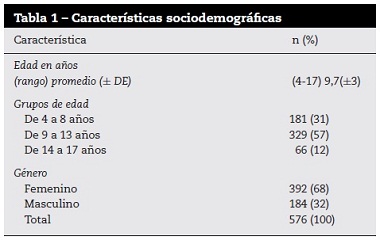 Se incluyeron 576 niños de un colegio de educación básica primaria, secundaria y media académica, de la ciudad de Pasto, en un rango de 4 hasta 17 años. Las características sociodemográficas se muestran en la tabla 1.