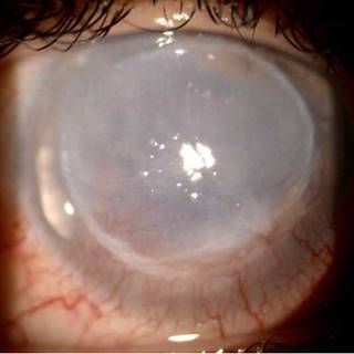 Fig. 1 Initial manifestations: 360° limbal superficial vascularization, cornea with 360° peripheral melting, epithelial ulcer, severe generalized edema, fibrin hypopyon.