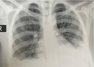Figura 1 Radiografía de tórax: proyección posteroanterior que evidencia derrames pleurales bilaterales y una imagen sugestiva de consolidación basal izquierda.