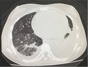 En la radiografía de tórax simple se observó la presencia de derrames pleurales y una imagen sugestiva de consolidación basal izquierda, a pesar de que la paciente no presentaba tos, esputo ni fiebre (fig. 1). En la tomografía simple de tórax se evidenció derrame pleural izquierdo con atelectasia compresiva ipsilateral y bandas parenquimatosas en la base derecha (fig. 2). El ecocardiograma realizado informó de fracción de eyección conservada con una presión sistólica de la arteria pulmonar elevada de 42 mm Hg (Vr. PsAp menor de 36 mm Hg). Se calculó el Systemic Disease Activity Index (SLEDAI) en 21 puntos, considerándose una exacerbación del LES severa. Se inició tratamiento con prednisolona a 30 mg por día, con lo que presentó mejoría de la disnea y de la saturación de oxígeno.