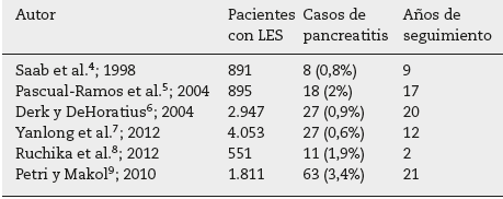 Tabla 1 Casos de pancreatitis en pacientes con lupus eritematoso sistémico según diferentes cohortes