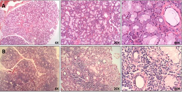 Fig. 1 Histopathological features of MSGB. Hematoxilin and eosin staining of minor salivary glands from A. Patient with non-specific chronic sialadenitis characterized by focal or scattered cell infiltrate adjacent to apparently normal acini and B. Patient with SS characterized by focal lymphocytic sialadenitis defined as the presence of >50 mononuclear cells in perivascular or periductal areas.