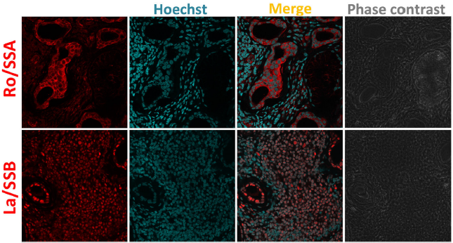 Fig. 2 Ro/SSA and La/SSB subcellular location in MSGB by indirect immunofluorescence. 4um-thick MSGB sections were tested with rabbit polyclonal anti-Ro/SSA/TRIM21 (ab91423) and rabbit monoclonal anti-La/SSB (ab124932). Secondary fluorescent antibody was goat anti-rabbit IgG alexa fluor 546 (red) mixed with Hoechst (blue) used to stain nucleic acids. The subcellular location of Ro/SSA antigen is nuclear and cytoplasmic. Ro/SSA is mainly found in the cytoplasm, whereas La/SSB is observed in nuclei.