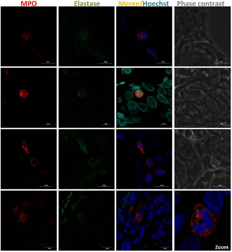 Fig. 3 Presence of neutrophils in MSGB from SS patients with FS >1. NET components in 4^m-thick MSGB sections were evaluated by double sequential immunofluorescence. Colocalization of MPO (red) with elastase (green) was detected using rabbit polyclonal anti-MPO (ab9535) and mouse monoclonal anti-neutrophil elastase (sc-55549). Secondary fluorescent antibodies were goat anti-rabbit IgG alexa fluor 546 (A-11010) and goat anti-mouse IgG alexa fluor 488 (A-11001) mixed with Hoechst or DAPI (blue) used to stain nucleic acids.