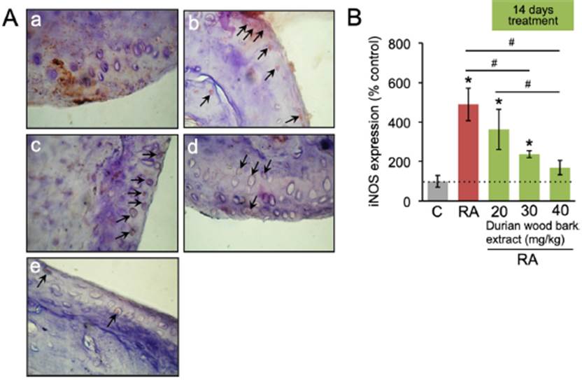 Fig. 3 The expression of iNOS in chondrocytes of articular cartilage. (A) representative images of iNOS expression in the articular cartilage; (a) control; (b) RA model; (c-e) RA model treated with durian wood bark extract at dosages of 20, 30, and40 mg/kg, respectively. The images were taken at 1000× magnification. (B) Quantification of iNOS expression. Data are expressed as a mean ± standard deviation (SD). (*) and (#) indicates a significant difference compared to control and between two groups indicated in the graphs (p < 0.05), respectively.