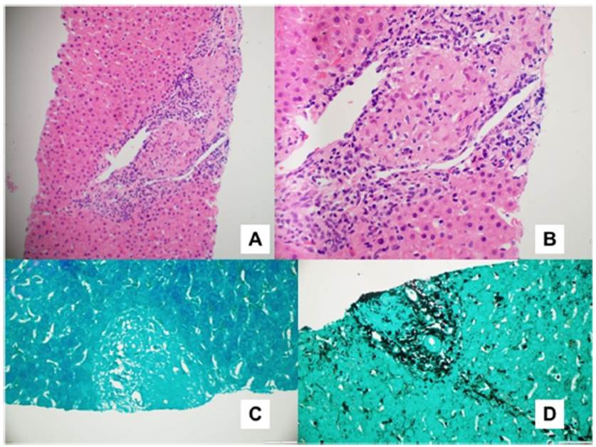 Se realizó biopsia de hígado donde se encontró inflamación crónica granulomatosa sin necrosis asociada, ubicada en la tríada portal, sin incremento del infiltrado inflamatorio portal ni periportal, no daño a las estructuras portales, ni evidencia de ductopenia, ductulitis, proliferación ductular o venulitis. En el lobulillo no se observó infiltrado inflamatorio considerable, esteatosis, balonamiento hepatocitario, megamitocondrias ni figuras histológicas sugestivas de hialina de Mallory, no se observó colestasis ni glóbulos hialinos (fig. 1). Se realizaron tinciones con Ziehl-Neelsen, Gomori, hierro, Orceína, PAS, tri crómico y retículo, negativas.
