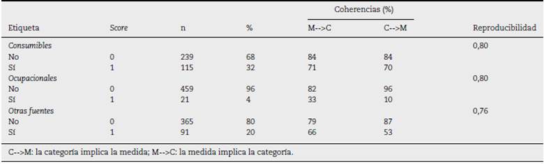 Las confiabilidades de Wright de las escalas fueron 0,75 para consumibles, y 0,58 para ocupacionales, en tanto que la dimensión de otras exposiciones obtuvo un valor de 0,69.