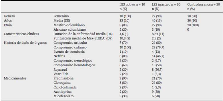 Se evaluó a 40 pacientes con LES y a 20 controles sanos, el 90% mujeres, con una media de 39 anos (DE 15). La distribución de pacientes con LES de acuerdo con la actividad de la enfermedad comprendió a 10 pacientes activos y 30 pacientes inactivos, clasificados según el índice MEX-SLEDAI. El 82,5% de los pacientes tenía compromiso cutáneo, el 77,5% compromiso articular, mientras que el 55% presentaba nefritis. En cuanto al tratamiento, los pacientes recibían principalmente esteroides y cloroquina (tabla 4).