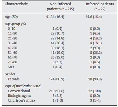 The database was analyzed for hospitalized and ambulatory patients at HOMIL between 2016 and 2020. Using SLE operative definition 307 patients were found, after revising their medical record, 70 patients were excluded as they didn't have a confirmed diagnosis according to the SLICC 2012 criteria. 237 patients were included. The mean age was 41.9 years old (CI 29.0-54.3), 80% were female, 56% had a Charlson's index of1; 97.7% used conventional DMARDs (Table 1). From these 237 patients, 22 (9.4%) met the operative definition of infection, in this group the mean age was 44.3 years old (SD 16.41). All of the 22 patients received conventional DMARDs and none of them had concomitant biologic therapy (Table 1). In this group of patients, the most common type of infection was bacterial (72.7%), followed by viral (9.10%) including a patient with SARS-CoV-2 infection, and 4 patients had fungal infection. 10 patients were taking systemic steroids; after reviewing their medical record, we found that 8 patients had active disease according to the systemic lupus erythematosus disease activity index (SLEDAI) scale at the time of the infection. 5 patients had positive anti-DNA antibodies, 4 has decreased complement, 5 has nephritis, 7 has leukopenia, and none of them were documented to have concomitant antiphospholipid syndrome. With respect to comorbidities, the mean Charlson's index for infected patients was 3; 1 patient has diabetes, none of them has Chronic obstructive pulmonary disease (COPD) or chronic renal insufficiency, none of the patients die due to the infection (Table 2).
