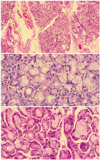 Fig. 1 Histology of normal minor salivary gland. A salivary gland with normal histology of a patient included in the study is observed in the three slices, in which mucinous acini with myoepithelial cells and ductus are seen. The upper image at 10× magnification and the lower images at 40× magnification. Source: own elaboration.