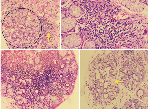 Fig. 2 Histology of an altered minor salivary gland. The upper left image shows a salivary gland biopsy of a patient included in the study, in a 10× slice with an aggregate of lymphoid cells (yellow arrow) adjacent to a normal-appearing salivary gland (blue circle). In the upper right image, the same aggregate is observed at a magnification of 40×. This aggregate can be counted as a focus. In the lower left image, a dense aggregate of lymphocytes is observed in the salivary gland background of one of the patients analyzed in the study, with atrophy and ductal dilation. In the lower image on the right, we can see a salivary gland biopsy with ductal ectasia (arrow) and atrophy. Source: own elaboration.