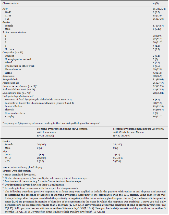 Presence of xerostomia was observed in 80 (86.96%) patients and xerophthalmia in 81 (88.04%) of them. The mean duration of the dry symptomatology in most of the 5 questions related to dryness was 12 months; the details of its duration is found at the bottom of Table 1. About a quarter of the patients were anti-RO positive (27.4%) and 36% had unstimulated salivary flow less than 1 ml/min. In addition, 21% and 57% of patients were positive for the ocular staining and Schirmer's test, defined according to the ACR/EULAR 2016 criteria, respectively. The general sociodemographic, clinical and histopathological characteristics are presented in Table 1.
