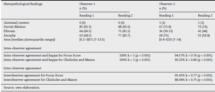 When evaluating the degree of intraobserver concordance for the histopathological reading of the minor salivary gland biopsy using the FS and CM methods for the diagnosis of FLS, perfect concordance was observed with the 2 methods for observer 1 and substantial or high concordance for observer 2, with kappa values of 0.76 and 0.80 for the reading when FS and CM were used, respectively.