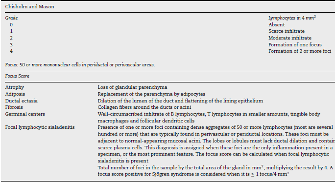 There are different methods for the interpretation of the MSGB (Table 3)6: the CM (1968) includes 5 grades, according to the presence of mild or moderate lymphocytic infiltration and/or focus of lymphocytes10; Greenspan and Daniels (1974),5) who added the concept of Focus Score (FS) currently used in the criteria for SS4; and Tarpley (1974),16 who introduced the concepts of acinar destruction and fibrosis. To date, there are no studies that directly compare the sensitivity and specificity of these methods. Despite the fact that the FS is the standardized method within the current classification criteria for SS, the CM method is still used in some centers,17,18 although the number of studies that used this scoring system was higher before the ACR/EULAR 2016 classification criteria.19,20