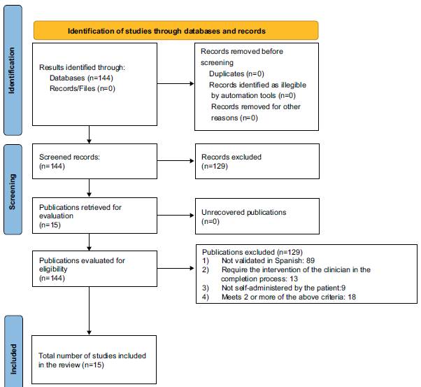 Within the inclusion criteria, instruments validated in Spanish, used to evaluate the outcomes of the disease and that can be answered in their entirety by the patient without the need for physician intervention or additional laboratory data (self-administered) were selected (see the Prisma dia gram, Fig. 1). The data collected were analyzed using tables that describe the name of the instrument, the outcome evalu ated (disease activity, functionality, quality of life, adherence to treatment, and impact of the disease), the number of ques tions in the instrument, the time it takes the patient to answer it, and the interpretation of the score.
